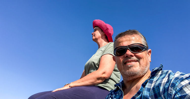 The pièce de résistance of the hike came next. The wind turned into a storm, and suddenly, we were standing on the cliffs as if the wind had personally come to say, "No further." Sandra fought valiantly against the gusts, but her floppy hat, determined to live its own life, was whisked away into the sky. But Sandra, quick as the wind itself, sprinted after it and caught it just in time, proudly waving it like a trophy. Clothes dirty, skin scratched, hair now styled into a permanent prickly hedgehog shape. But she stood proud, showing the hat who was boss. For the rest of the hike, she held it in an iron grip.