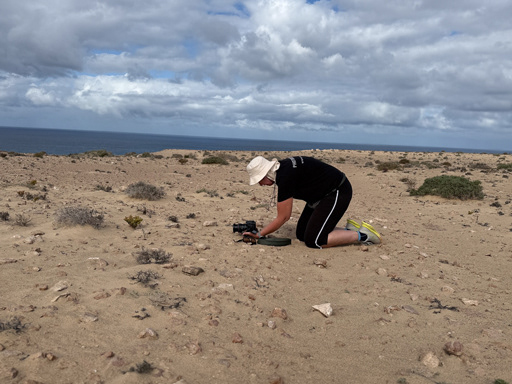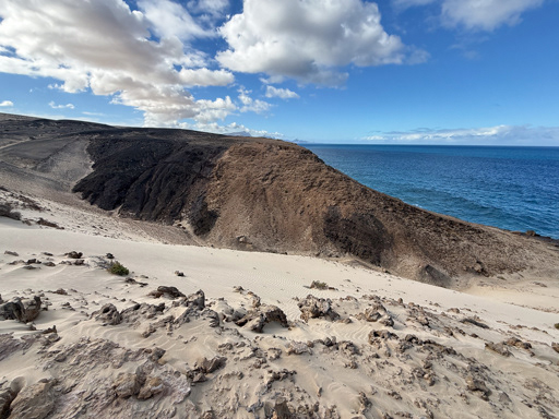 Solo vimos a dos ciclistas empujando sus bicis. Arena profunda. ¿Quién espera encontrar playa con conchas en plena roca volcánica? Fuerteventura tiene su propio sentido del humor.