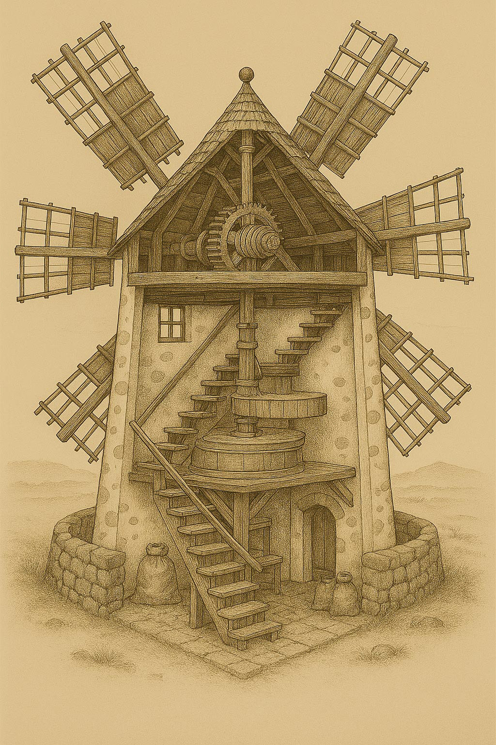 Cuando el viento se intensificaba, las aspas del molino comenzaban a girar. La parte superior del molino – la cúpula giratoria – se orientaba para captar el viento de la mejor manera posible. Entonces se ponía en marcha el engranaje de madera que accionaba las pesadas piedras de moler. Era una armonía perfecta entre la fuerza de la naturaleza y el ingenio humano.